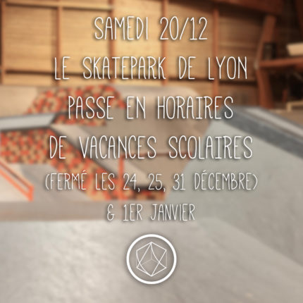 Jusqu’au dimanche 4 Janvier inclus, le Skatepark de Lyon ouvrira ses portes à partir de 14h00, session du soir ouvertes a toutes les disciplines du Lundi au Samedi